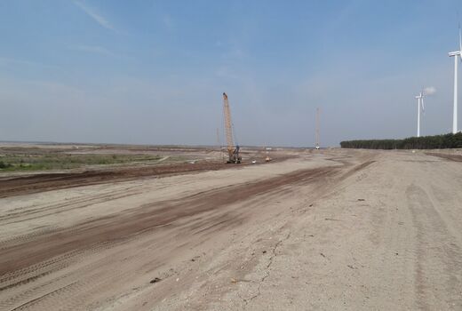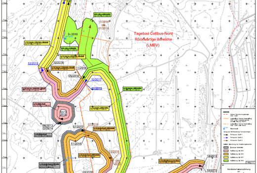 Nach Einstellung der Kohlegewinnung ist der Restraum vom Tagebau Cottbus-Nord unter Berücksichtigung der vorgesehenen Nachnutzung und des nachbergbaulichen Grundwasserstandes standsicher zu gestalten. Da für die vorhandenen sehr lockerer bis locker gelagerten Kippenböden bei Wassersättigung eine Setzungsfließ- und Verflüssigungsgefahr besteht, wurden als erforderliche Sicherungsmaßnahmen die Herstellung „versteckter Dämme“ mittels Rütteldruckverdichtung mit anschließender Oberflächenverdichtung und Geländeprofilierungen ausgewiesen. Durch die GICON®-Großmann Ingenieur Consult GmbH erfolgten die Standsicherheitsuntersuchungen für die Innenkippenbereiche, Stützkörperdimensionierungen einschließlich Ermittlung von Grenzwasserständen, die Ausführungsplanungen für die Herstellung der Stützkörper mittels Rütteldruckverdichtung, geotechnische Objektbetreuungen mit Auswertungen zum erzielten Verdichtungserfolg einschl. Festlegung zum Umfang/Technologie der Oberflächenverdichtung. Weiterhin wurden Ausführungskonzepte für den gleichzeitigen Einsatz von bis zu fünf Trägergeräten für die Rütteldruckverdichtung und drei für die Fallgewichtsverdichtung aufgestellt, welche auch die Erdbaumengen für Vor-, Zwischen- und Endprofilierungen unter Berücksichtigung optimierter Transportentfernungen beinhalteten. Die erforderlichen Erdbau- und Verdichtungsleistungen wurden durch GICON® ausführungsreif geplant und in der Realisierung durch eine geotechnische Fachbauleitung begleitet. Die Bauausführung begann in 11/2012 zunächst mit einem umfänglichen Testbetrieb (Umfang ca. 4 Mill. m³ RDV-Volumen). Im Regelbetrieb wurden in insgesamt 10 Bauabschnitten 46 Mill. m³ Kippenvolumen verdichtet. Zur Verdichtungskontrolle wurden anfallende Proessdaten mittels hauseigenem Datenbanksystem SCMS ausgewertet. Anhand von Verdichtungsnachweisen für die Uferstützkörper konnte die Flutungsbereitschaft termingerecht im Herbst 2018 nachgewiesen werden. Mit der Flutung wurde im Frühjahr 2019 begonnen. Seitdem erfolgten noch Restarbeiten im Übergangsbereich vom Uferstützkörper zum Hinterland sowie im weiteren angrenzenden Hinterland. Der Abschluss der Sicherungsarbeiten in den Uferbereichen wurde im Juni 2020 und im Hinterland für den künftigen Teich „Lieskower Loch“ im Juni 2021 erreicht. Aktuell werden bei GICON® ein Hauptgutachten für das künftige Ostufer einschl. Inseln und eine komplexe Innenkippenbewertung für das Hinterland erstellt.