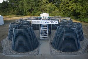 Microalgae are unicellular, fast-growing plants that can be cultivated using less land and water consumption than terrestrial plants. Together with its partners, Anhalt University of Applied Sciences and Wacker Chemie AG, GICON® has succeeded in developing the innovative GICON® Photobioreactor (PBR) system. The PBR is based on a conical supporting structure reminiscent of the shape of a Christmas tree. A double-chamber tube made of resistant, low-maintenance silicone is placed on this adaptable frame. Due to the separate flowing of the algae mass in one chamber and water for tempering in the second chamber, the GICON® PBR can be used all year round and worldwide. Several patents have been applied for this system- and process-engineering solution. In addition to the Central German Biosolar Center at the University of Applied Sciences in Köthen, GICON® also operates an industrial demonstration plant with a GICON® PBR Octagon at the Cottbus site.